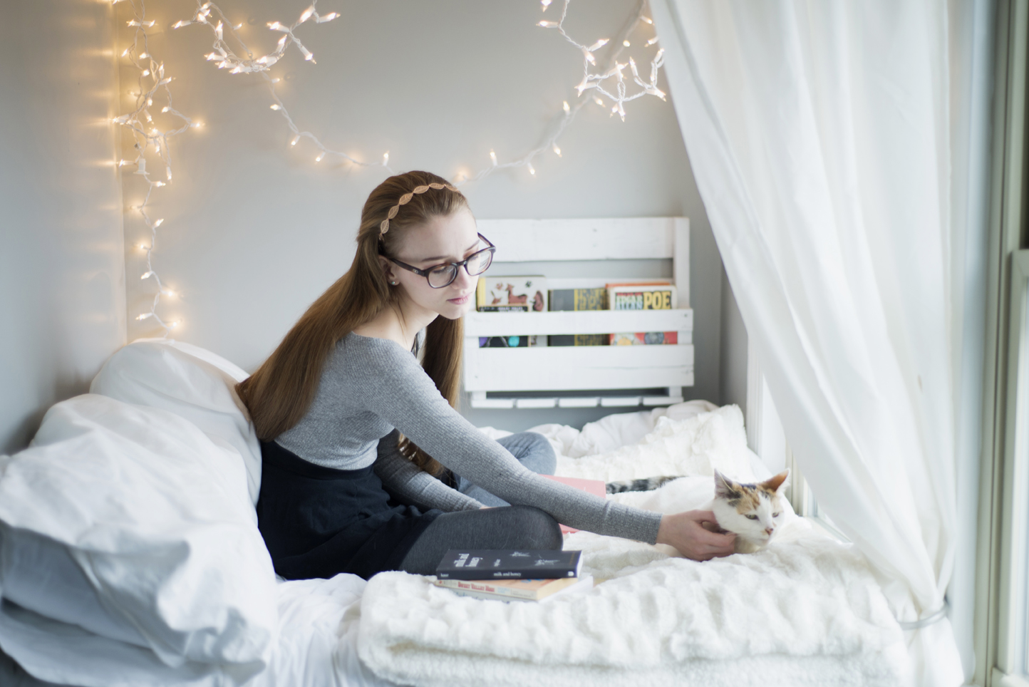 This little cutie right here, is my sister-in-law. I had the honor of taking her senior portraits a few weeks ago. She wanted to take them at my house with Paisley and all three of our crazy cats. Kiley is an avid reader, so she also wanted photos with some of her favorite books in our reading nook. She got her wish of there being snow on the ground for her session. Hopefully our last snow of the year! Kiley is a sweet girl with a tender heart and I think her photo session completely captures who she is… She prefers hanging at home, being surrounded by animals, and snuggling up with a good book.